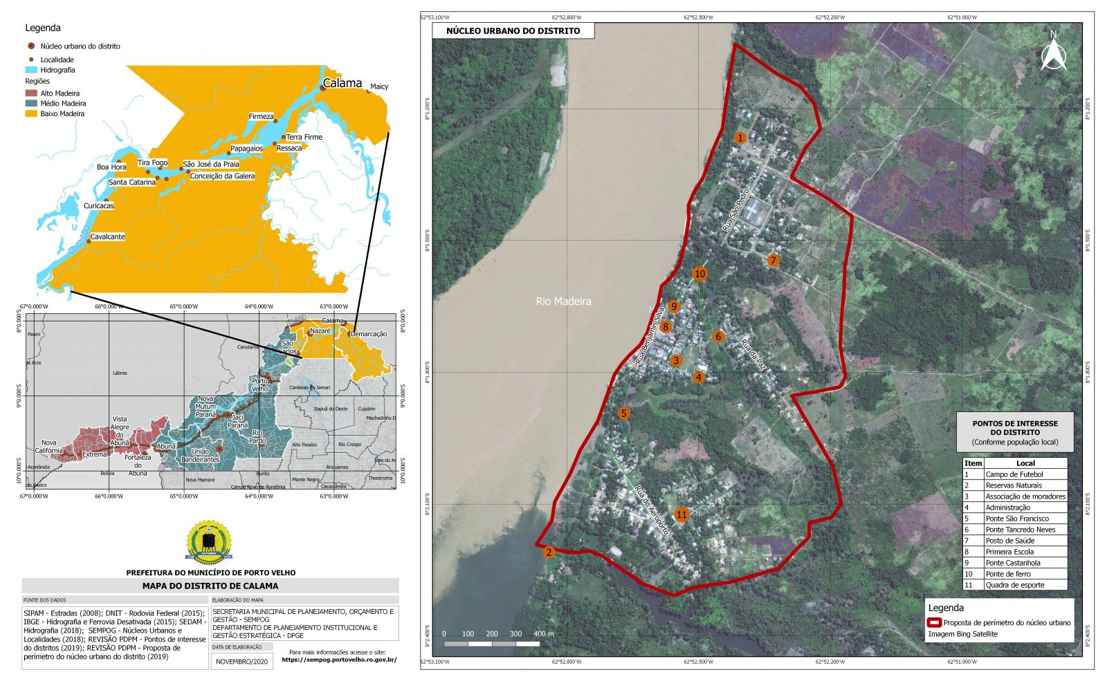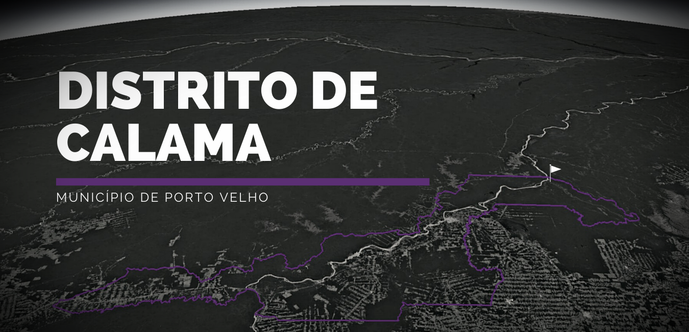 O Distrito de Calama tem seus limites assim definidos: Partindo da foz do Rio Maicimirim no Rio Madeira, sobe o Rio Maicimirim até o Igarapé Morceguinho, sobe por este até a sua Cabeceira com coordenadas de S 8º 08’ 27’’ e W 62º 43’ 26’’; daí segue por uma linha reta com distancia de 4.200 m até alcançar a cabeceira do Igarapé Azul com coordenadas de S 8º 09’ 39’’’ e W 62º 45’ 20’’; deste ponto, desce pelo Igarapé Azul passando pelo Lago de Jacundá e Lago do Emir (exclusive) até o Rio Machado ou Ji-Paraná; segue por este contornando a Ilha de São Pedro (inclusive) até o Rio Preto; sobe por este até o Paralelo 8º 30’ 00’’; segue por este Paralelo até o Rio Jamari; desce por este até o Rio Madeira; desce por este até o Igarapé Prainha, sobe por este até o limite da Floresta Estadual de Rendimento Sustentado do Rio Madeira “A” com Resex Rio Cuniã; segue por este limite até o Paralelo da foz do Rio Maicimirim no Rio Madeira; segue por este Paralelo até o ponto inicial. Possui as seguintes localidades dentro da sua divisão territorial, até a data de 19/11/2020: